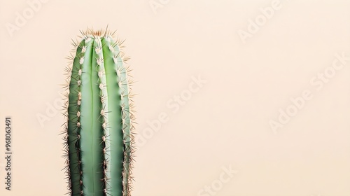 Naklejka premium A tall desert cactus with vibrant green spines against a soft beige...