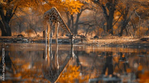 © Prostock-studio, Fototapeta premium A tall giraffe bends down to drink from a calm water source, surrounded by trees adorned in rich autumn colors of orange and yellow, creating a serene atmosphere.