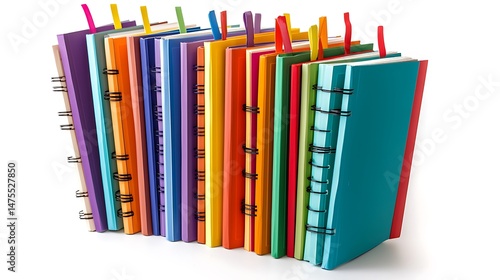 © Sami_Art, Naklejka premium A tall pile colorful notebooks arranged neatly, isolated on a clean white background, perfect for an educational theme