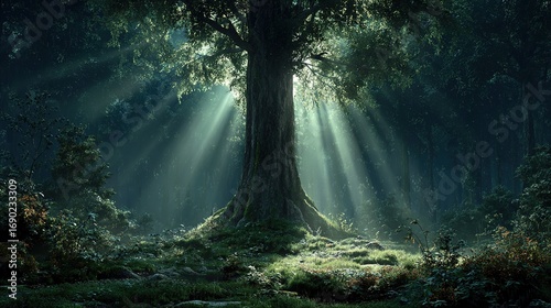 © li, Obraz premium a tall tree stands in the middle of a dark forest, with light rays shining upon it.