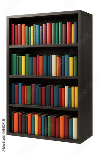 Fototapeta premium A tall wooden bookshelf filled with colorful, neatly arranged books on transparent background.