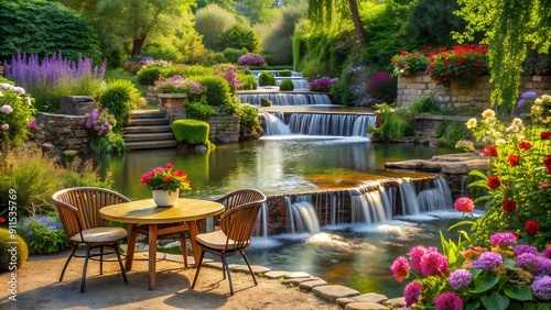 Fototapeta premium A Tapestry of Blooms and Water's Grace: A Miniature Food Garden by the...