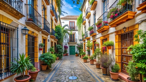 © Sanook, Fototapeta premium A Tapestry of Tile and Stone: A Street in Seville's Barrio Santa Cruz AI Generated