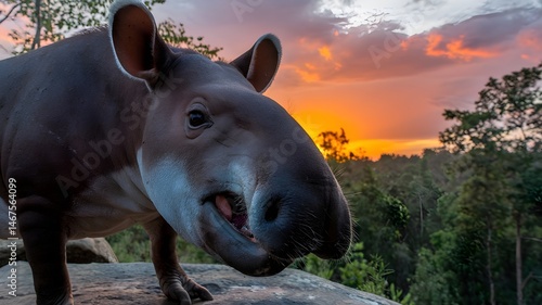 Fototapeta premium A tapir standing in front of a beautiful sunset, with a hint of joy