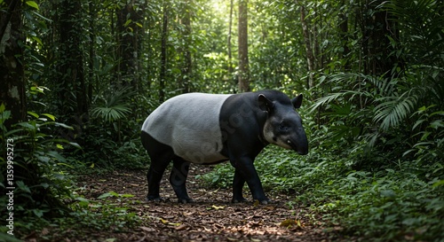 © HeriAfrilianto, Fototapeta premium A tapir walking on a path surrounded by lush green forest