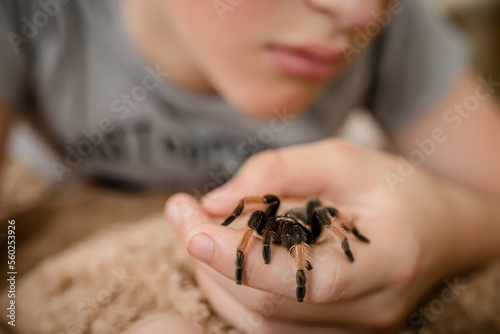 © Maryna, Obraz premium A tarantula spider in the hands of a teenage child. A boy plays with scary pet. brave boy plays with huge spider Brachypelma albopilosum. Treatment of arachnophobia