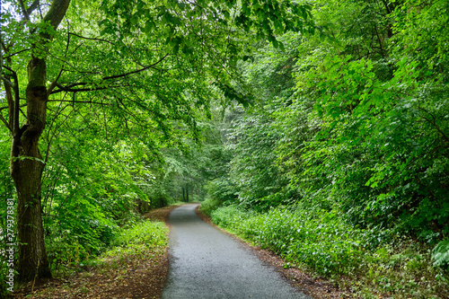 Obraz premium A tarred footpath and cycle path leading through a beautiful green forest with fresh lush foliage
