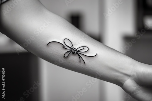 © Sanchai, Obraz premium A tattoo of a quote in elegant cursive, wrapping around the forearm or across the ribcage, serving as daily inspiration