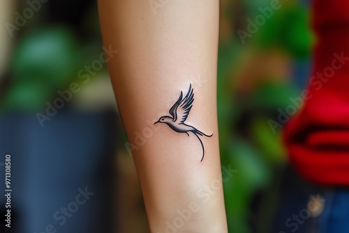 © Sanchai, Obraz premium A tattoo of a single continuous line forming the shape of a bird in flight, symbolizing freedom and resilience