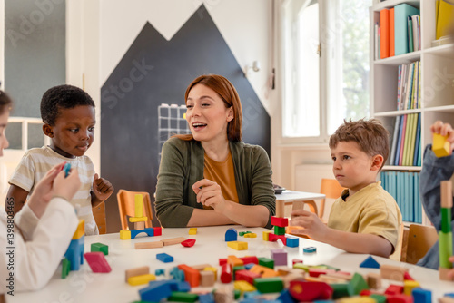 © lordn, Fototapeta premium A teacher and diverse group of children build with colorful blocks in a classroom, promoting teamwork, creativity, and multicultural early learning.