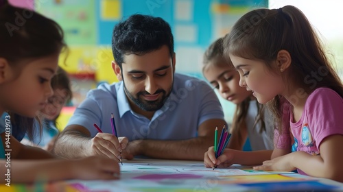 Fototapeta premium A teacher guides young children in a colorful classroom during an art activity, fostering creativity and collaboration in the afternoon
