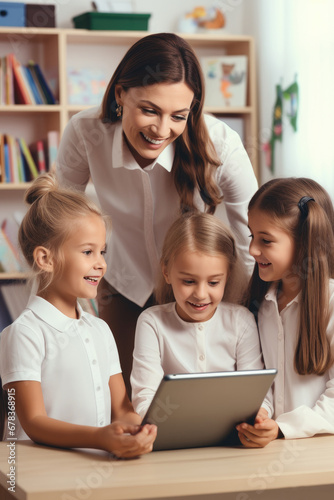 © piai, Fototapeta premium A Teacher Holding a Tablet Computer Explaining Lesson to a Young Children