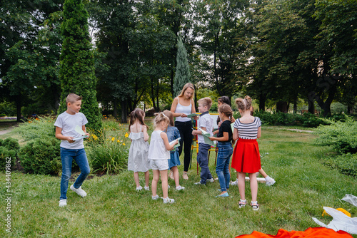 Obraz premium A teacher teaches a class of children in an outdoor Park. Back to school,...