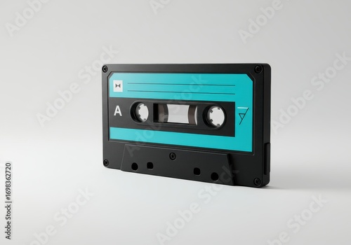 Obraz premium A teal-colored audio cassette tape sits prominently against a plain, light...