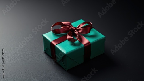 Obraz premium A teal gift box adorned with a luxurious burgundy bow, resting on a dark...