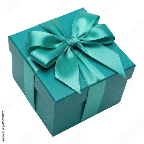 © Shanewaz, Obraz premium A teal gift box with a satin ribbon and bow isolated on transparent background