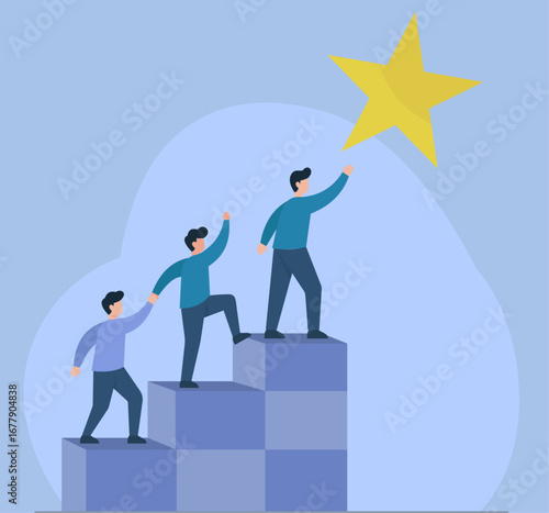 Fototapeta premium A team helps each other climb stairs toward a star, symbolizing...