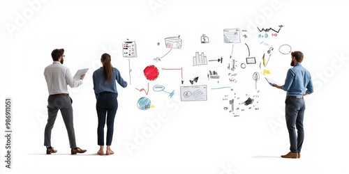 Fototapeta premium A team of three professionals brainstorming and drawing ideas on a whiteboard, collaborating on future projects.