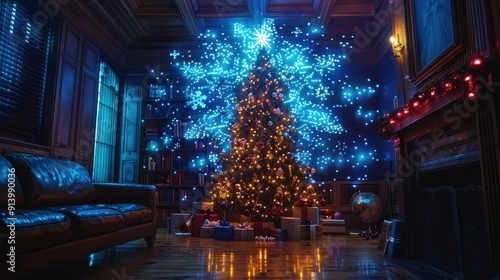 © HARRY, Obraz premium A tech-savvy Christmas tree featuring smart lights, digital ornaments, and a holographic star topper.
