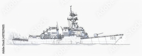 © Volodymyr, Obraz premium A technical drawing of a naval destroyer, showcasing its radar systems, missile launchers, and hull design. The white background highlights the ship's advanced technology and combat capabilities.