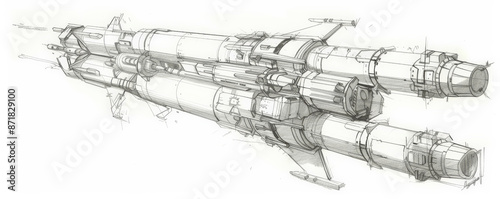 Obraz premium A technical sketch of a rocket launcher, highlighting the launch tube, targeting systems, and stabilization features. The white background emphasizes the precision and power of the weapon.