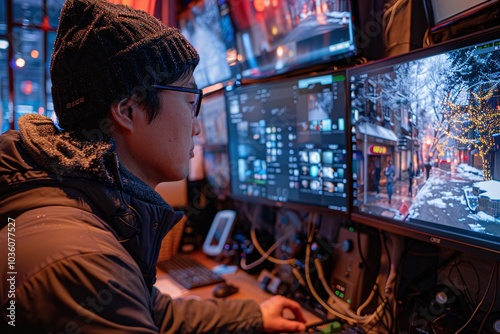 © dyshlivenko, Obraz premium A technician, wearing a winter hat and jacket, is focused on several computer screens displaying snowy city streets and festive lights. The atmosphere is cozy and tech-driven