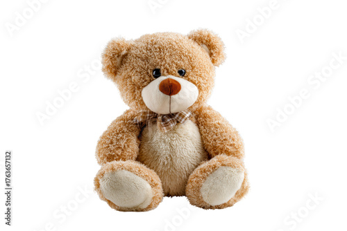 Obraz premium A teddy bear is sitting on a white background. The bear is brown and has a...