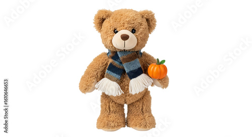© Shah Zain, Obraz premium A teddy bear with a scarf holds a pumpkin isolated on transparent background