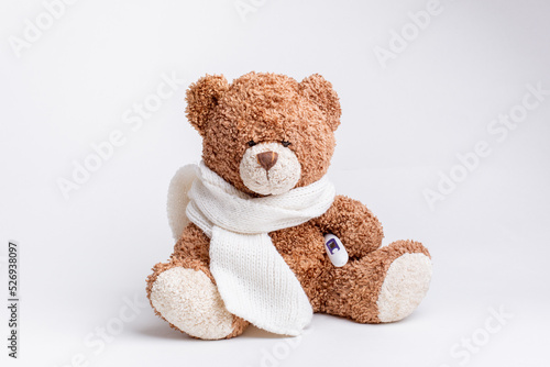 © Olesya Pogosskaya, Obraz premium a teddy bear with a thermometer and a knitted scarf is sick on a white background, isolated