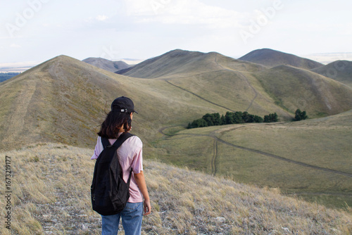 © Viktoriia Nam, Naklejka premium a teenage girl is standing with her back to the camera, holding a black backpack and looking out at the Karamuruntau mountain range