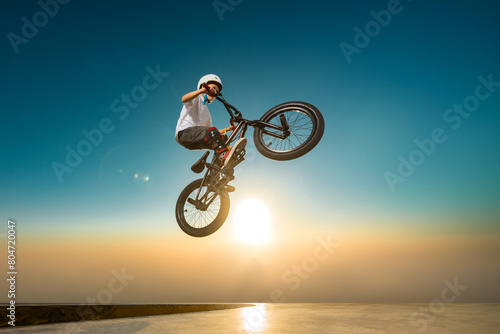 © Mike Orlov, Fototapeta premium A teenager BMX Racing Rider performs tricks in a skate park on a pump track.