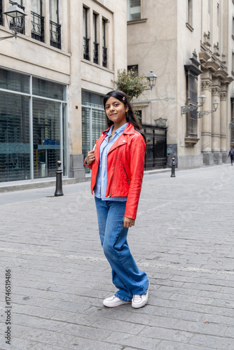 © Erik González, Fototapeta premium A teenager in a red jacket and blue jeans stands on a sidewalk