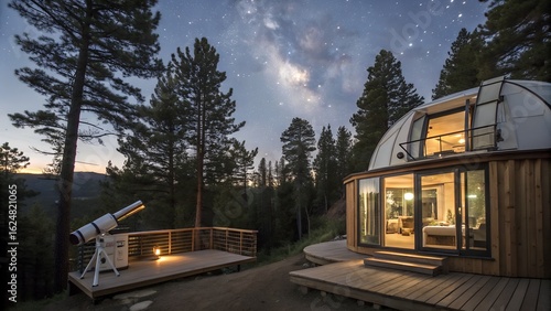 © OpulentNest, Obraz premium A telescope and dome house under a starry night sky surrounded by tall trees in a forest setting