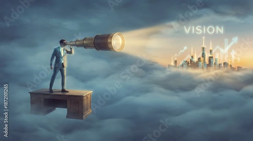© dimensdesign, Fototapeta premium A telescope looking through thick fog, representing the need for clear business vision in uncertain times.