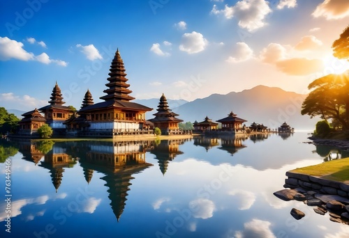 © rjsoni, Naklejka premium a temple with a lake and mountains in the background.