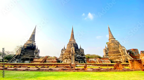 © Thebt, Fototapeta premium A temple with three pagodas arranged in a row.