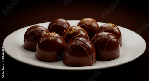 © Rafael, Fototapeta premium A tempting array of chocolate delicacies, decorated with decadent lines and sprinkles, on a white plate.