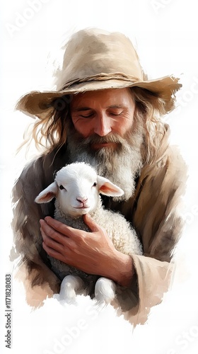 © Raul, Obraz premium A tender moment: An older Caucasian shepherd gently cradles a young lamb. Warm earth tones and soft light create a peaceful scene.