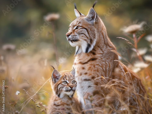 © Jan, Fototapeta premium A tender moment between a bobcat mother and her cub in the wild.