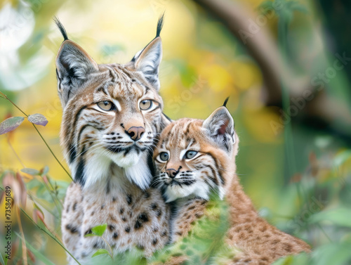 © Jan, Fototapeta premium A tender moment between a bobcat mother and her cub in the wild.