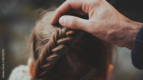 Naklejka premium A tender moment captured, a hand gently resting on braided hair, symbolizing affection and care. The braid showcases meticulous detail in interwoven strands.