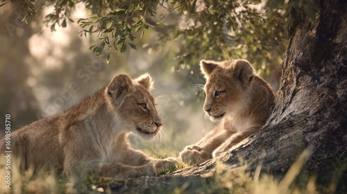Naklejka premium a tender moment in a natural habitat where two lions are sitting close...