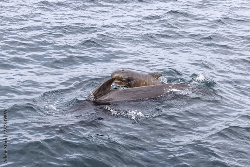 © Artem, Fototapeta premium A tender moment unfolds in the North Atlantic as a pilot whale calf and mother share a close interaction off the coast of Andenes, Lofoten Islands.