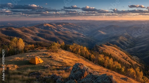© Anna, Fototapeta premium A tent perched atop a mount, offering panoramic views of valleys and distant peaks during twilight