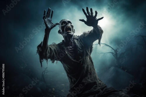 Fototapeta premium A terrifying undead zombie reaches out in an abandoned graveyard under the...