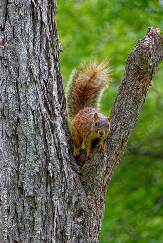 © Julian, Obraz premium A Texan Fox Squirrel with it tail raised, on a fork in the branches of a Pecan Tree in a backyard of a property near Richmond.