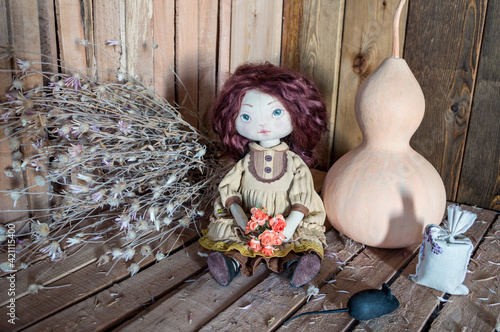 Fototapeta premium A textile interior doll sits on a wooden background with a pumpkin, dried...