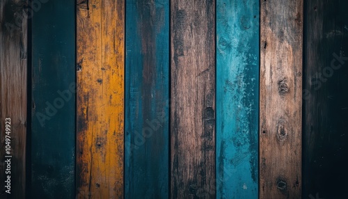 Fototapeta premium A textured background featuring a colorful arrangement of weathered wooden...
