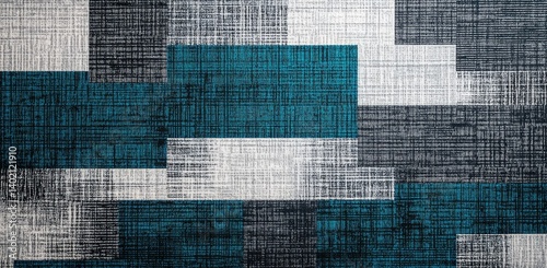 © SUUGOIisME, Fototapeta premium A textured fabric background featuring an abstract patchwork design of blue. grey. and black squares. ideal for interior design or textile applications