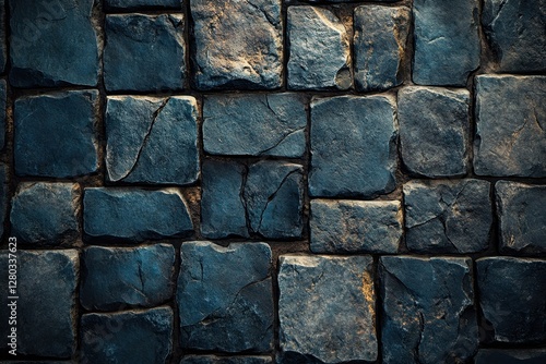 Fototapeta premium A textured stone wall background featuring irregularly shaped dark stones, suitable for graphic design, construction themes, or as a backdrop for creative projects, The design offers a rugged appeal,